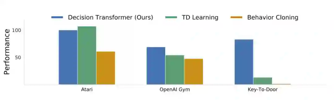 研究者扩展到了离线强化学习文献中常用的基准,即 Atari 学习环境、OpenAI Gym、Minigrid Key-To-Door 任务。在离散和连续控制以及状态和图像观察的多样化任务中,他们发现 Decision Transformer 的性能可以媲美经过充分研究的专业 TD 学习算法的性能。