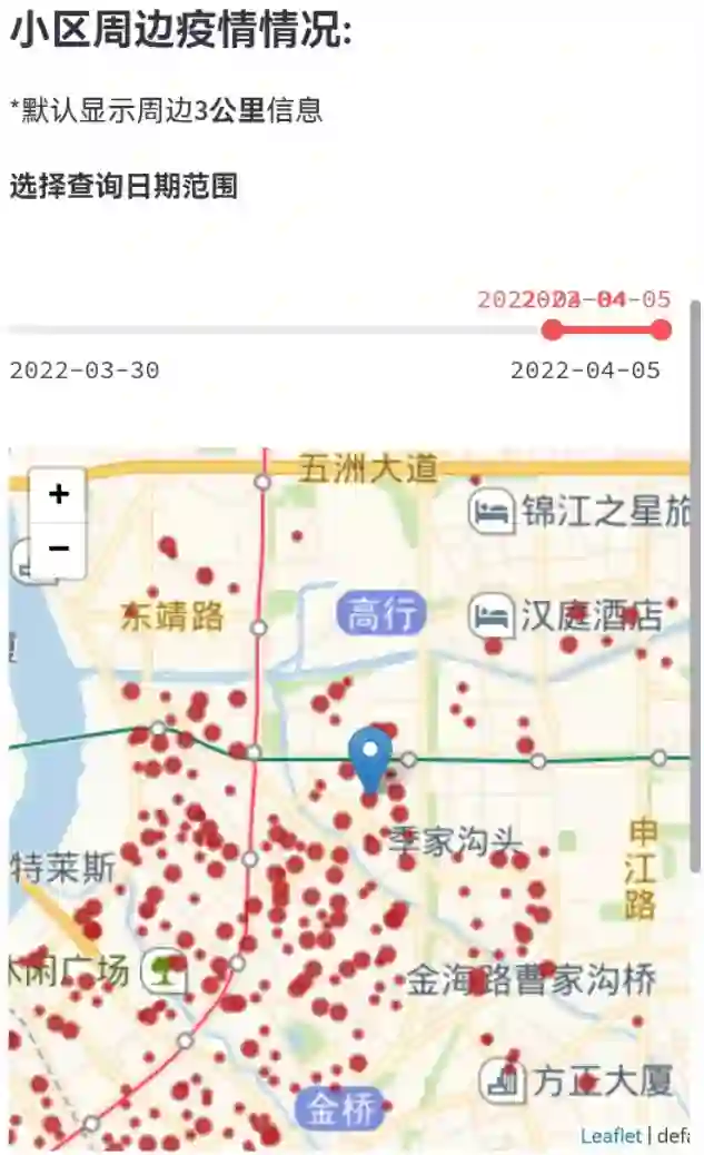 【社区情况】在“输入关键词搜索”搜索框输入街道信息,可获取相关社区周边3公里的疫情通报数据记录实况;
