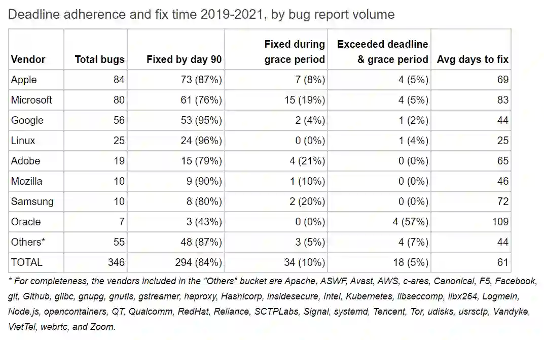 Project Zero 指出,总的来说,他们在数据中捕捉到了一些很好的趋势。在过去的三年里,供应商大都加快了他们的补丁速度,有效地将 bug 平均修复时间减少到约 52 天,就拿 2021 年举例,只有一个 90 天的期限被超过。总体而言,所有公司在修复 bug 方面都变得越来越好、越来越快。