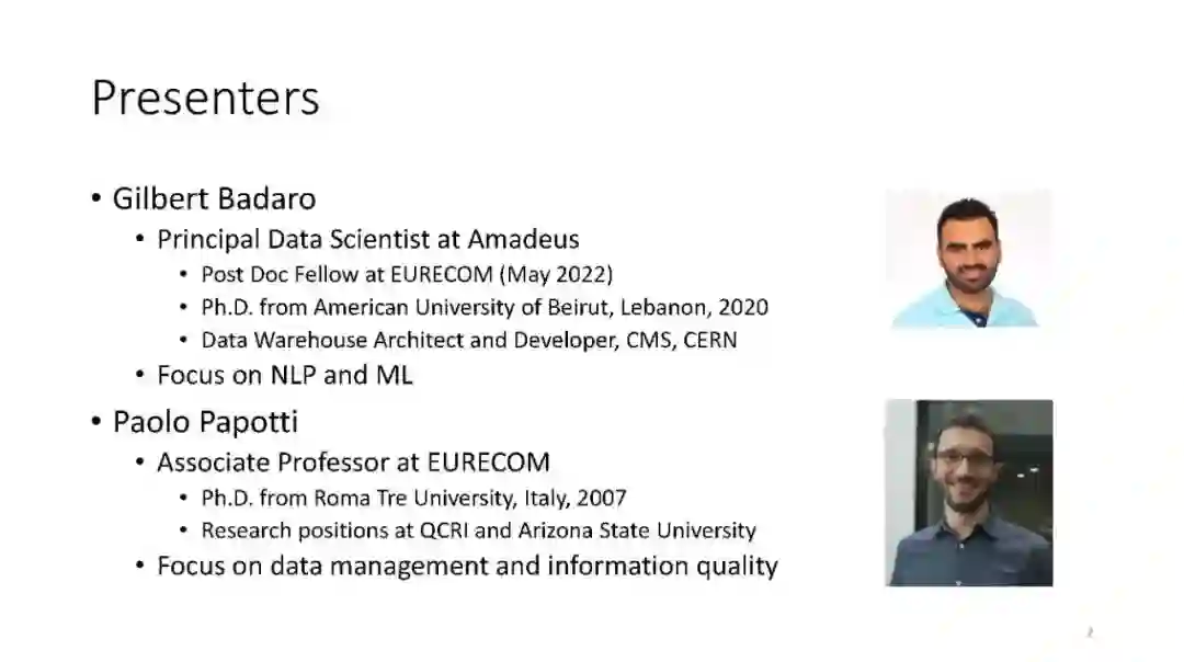 在过去的几年中,自然语言处理界见证了基于transformer的语言模型(LM)在自由文本的神经表示方面的进展。鉴于关系表中可用知识的重要性,最近的研究工作通过开发表格数据的神经表示扩展了语言模型。在本教程中,我们提出这些建议有两个主要目标。首先,我们向数据库观众介绍当前模型的潜力和局限性。其次,我们将演示从transformer体系结构中受益的大量数据应用程序。本教程旨在鼓励数据库研究人员参与并为这个新方向做出贡献,并为实践者提供一组用于涉及文本和表格数据的应用程序的新工具。