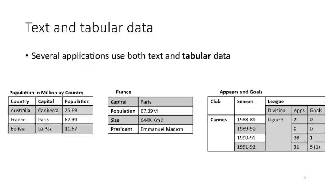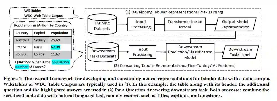 神经的方法。基于注意力机制的transformer模型已被成功用于开发预训练语言模型(LMs),如BERT[9]、RoBERTa[24]。与传统技术相比,这些LMs在目标文本任务(如情感分析)中取得了惊人的效果,使NLP领域发生了革命性的变化[2,3]。然而,transformer已被证明能够超越文本,并已成功地用于视觉[10]和音频[14]数据。遵循这一趋势,transformer在开发表格数据表示方法方面开始受到欢迎。本教程关注渲染transformer架构的核心问题“数据结构感知”,并将设计选择和对大量下游任务的贡献联系起来。与会者可以了解根据目标应用程序使用transformer的不同方式。的例子。当采用基于transformer的方法时,选择范围从采用现有的预训练模型(从数百万表中创建)到从头开始构建解决方案。作为transformer架构的一个例子,请考虑图1。使用顶层管道创建语言模型(1)。例如,在BERT[9]中,通过自监督任务处理大量文档语料库,以创建模型,然后用于构建以文本为中心的应用程序。模型的创建是昂贵的,但是任何有在线Python笔记本的从业者都可以使用最终的模型。构建应用程序最流行的方法是使用少量的特定示例(例如,文档分类或情感分析)对这种模型进行微调。这在底层管道(2)中得到了描述。从文本数据转移到表格数据,一些方法使用了一个表的语料库来创建一个预先训练的模型,它“理解”表格格式(1)。目标应用程序现在可以使用这个模型来处理下游任务(2)。在(1)和(2)中,表首先被序列化并连接到其内容,以将其作为输入提供给变压器。例如,在(1)中,训练数据可以是从维基百科中提取的大量表的语料库。(2)是使用预训练的模型直接回答用自然语言对给定表表示的查询。示例的输入是一个表,以及它的标题“以百万计的国家人口”作为上下文,以及关于法国人口的问题。期望的输出是给定表中突出显示的单元格。当预训练模型不足以满足任务时,可以用少量示例进行微调(2)。在某些情况下,模型是从头开始进行预训练的(1),以利用对典型transformer架构的新扩展,以考虑表格结构,这与传统的自由文本不同,有时更丰富。
