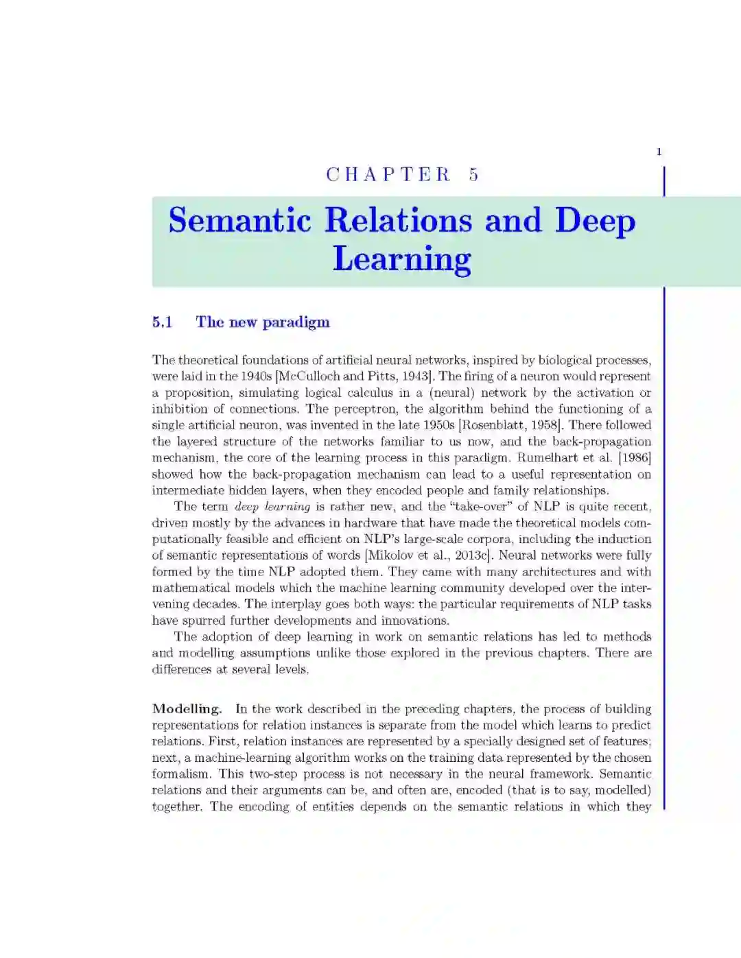 受生物过程的启发,人工神经网络的理论基础于20世纪40年代奠定[McCulloch and Pitts, 1943]。神经元的放电代表一个命题,通过激活或抑制连接来模拟神经网络中的逻辑演算。感知器(perceptron),一种解释单个人工神经元功能的算法,发明于20世纪50年代末[Rosenblatt, 1958]。随之而来的是我们现在熟悉的网络的分层结构,以及反向传播机制,这一范式的学习过程的核心。Rumelhart等人[1986]展示了反向传播机制如何在对人和家庭关系进行编码时,在中间隐藏层上产生有用的表示。术语深度学习是相当新的,NLP的“接管”是最近才出现的,主要是由于硬件的进步使得NLP的大型语料库的理论模型在计算上可行且高效,包括单词语义表示的归纳[Mikolov et al., 2013c]。当NLP采用神经网络时,神经网络已经完全形成。它们带来了许多架构和数学模型,这些都是机器学习社区在这几十年里发展起来的。这种相互作用是双向的:自然语言处理任务的特殊要求刺激了进一步的发展和创新。在语义关系研究中采用深度学习,带来了不同于前几章探讨的方法和建模假设。