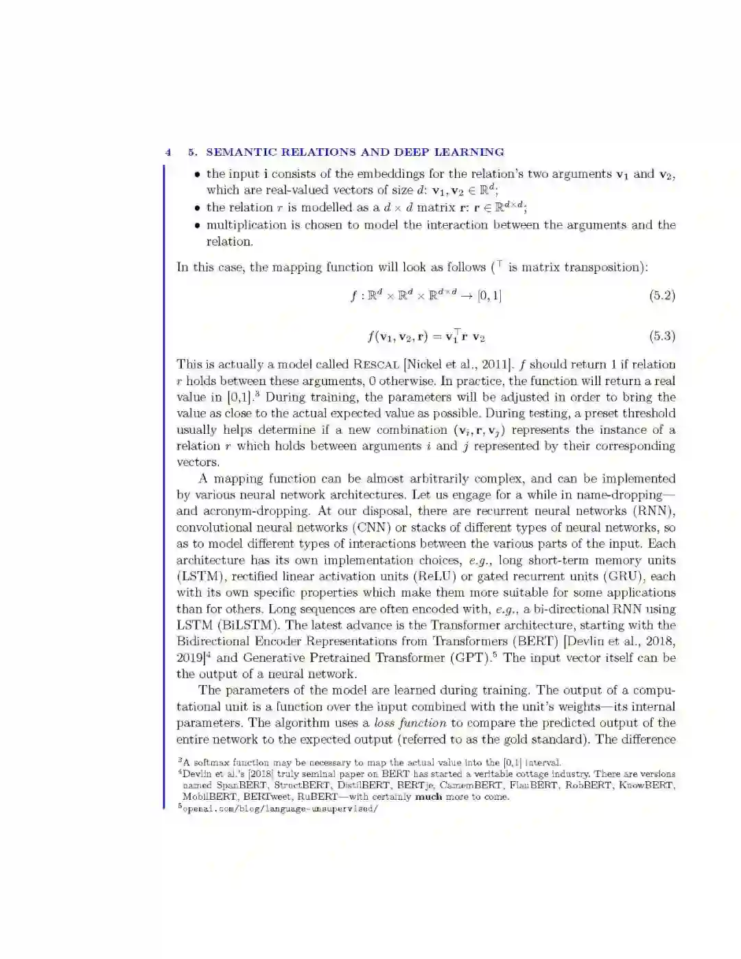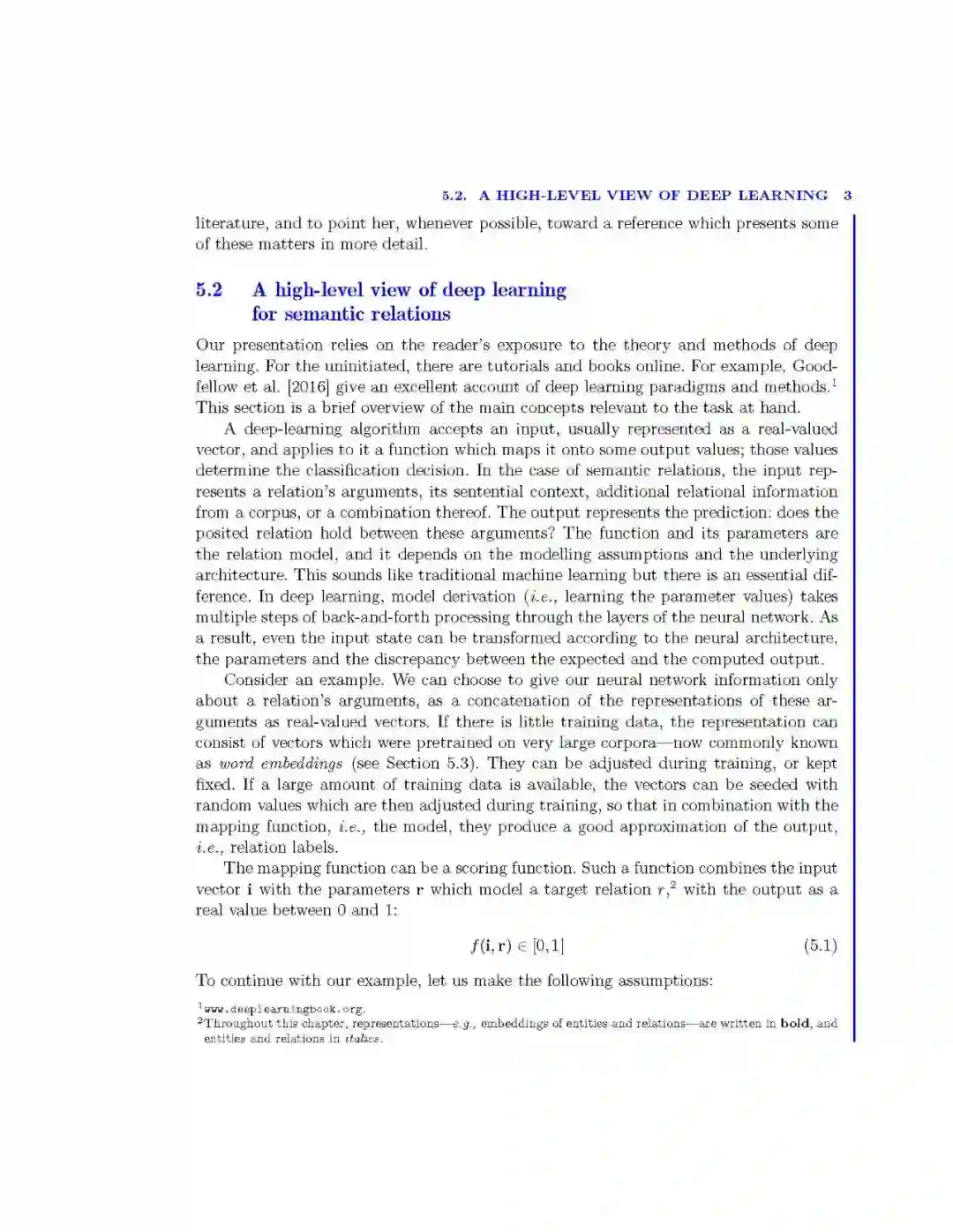 我们在5.2节以深度学习的高级概述开始本章。然后我们再回顾与语义关系相关的研究问题。语义关系的深度学习通常在一个体系结构中结合了对包含候选关系的整个句子的处理。论证的含义的表达将与上下文的表达和关系线索交织在一起——关系论证和周围的文本之间的表达。为了使事情更清楚,并允许未经尝试的组合,单词表示(属性特征,第5.3节)是分开的关系线索和上下文(关系特征,第5.4节)。第5.5节讨论了对数据集的关注,特别是对远程监督的深度学习解决方案:如何自动获取和处理大量有噪声的训练数据。第5.6节讨论语义关系的学习和建模,无论是作为特定结构还是作为神经模型;它展示了在不同的学习模式中,论点的表征和上下文线索是如何相互交织的。