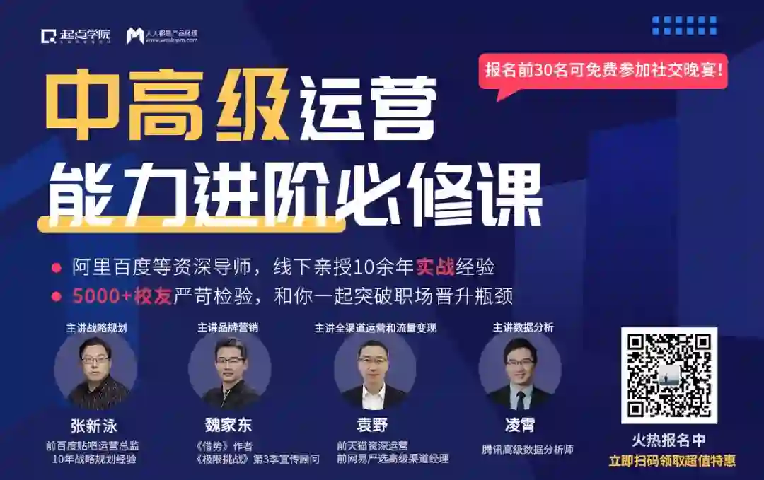 这里推荐由起点学院联合腾讯百度打造了【运营总监修炼之道】课程致力于帮助大家更好的理解和学习中高级运营经理的进阶能力模型,梳理当前工作中的问题,搭建晋升运营总监必备的四大核心能力模型,从而更好的提高团队效率和产出结果。