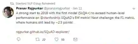 SQuAD的负责人Pranav Rajpurkar难掩兴奋之情。他在社交媒体上表示,2018年一个强劲的开始,第一个模型(阿里巴巴iDST团队提交的SLQA +)在精准度匹配上超越人类表现!下一个挑战:模糊匹配,人类仍然领先2.5分!
