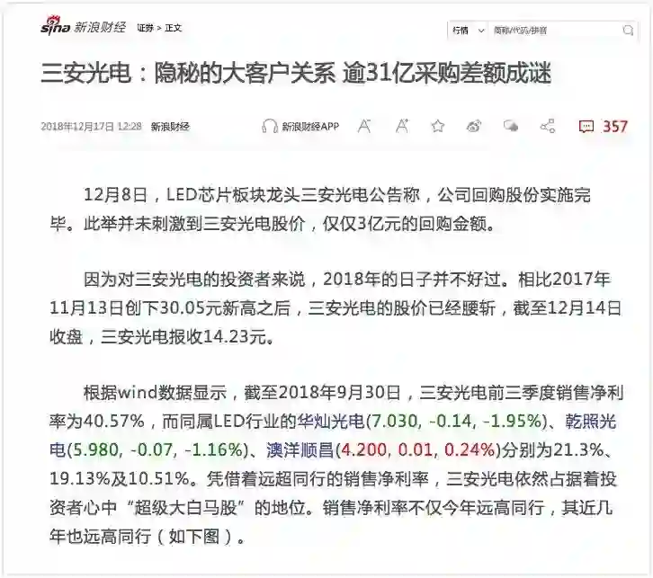 三安光电最近一波媒体质疑始自2018年12月15日新浪财经发布的《三安光电:隐秘的大客户关系 逾31亿采购差额成谜》。文章发布的背景是三安光电回购股份实施完毕,并未刺激股价,相比2017年11月13日创下的30.05元新高,一年后的12月14日,三安光电股价腰斩,报收14.23元。