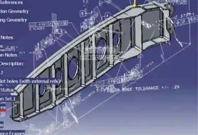 2)三维设计工具。三维设计工具较多,常见的有Pro/E、SolidWorks和CATIA等,其中以达索公司的CA⁃TIA最具代表性,是波音和中国航空工业使用的主流三维设计软件。在设计时,要在CATIA软件中生成零件的三维实体模型、零件结构的尺寸和公差标注等(图2)。除以上基本信息外,还应标注一些关键特征、零件的注释说明、加工工艺要求和装配连接定义等。在建模方面,CATIA提供了通用机械零件设计模块,航空钣金零件设计模块、复合材料设计模块、管路设计模块及电气系统设计模块等。