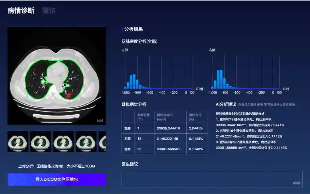 根据国家卫健委公布的诊疗方案第五版,CT影像临床诊断结果可作为新冠肺炎病例判断的标准,无需依赖核酸检测结果。因此对于奋战在一线的医生而言,每天需要看大量的CT影像,以对患者的病情发展和治疗效果进行精准评估。