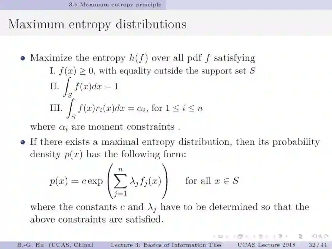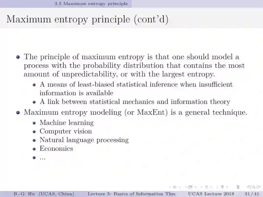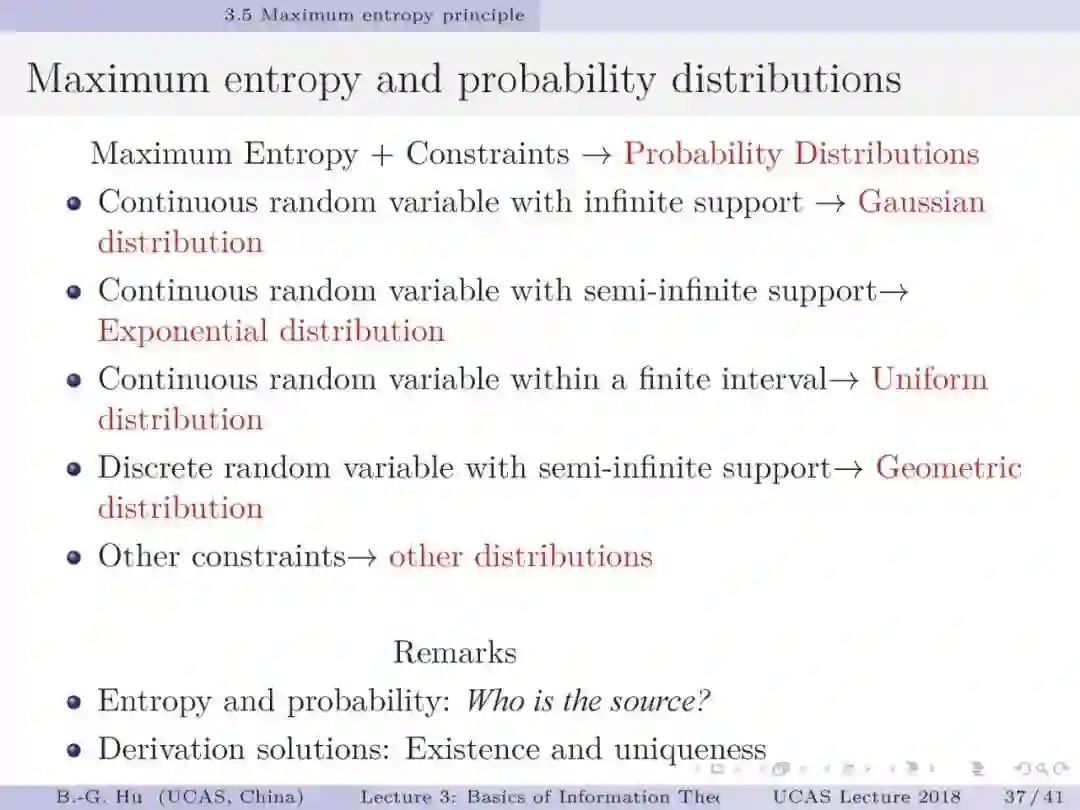 【导读】这章主要是对连续变量熵等相关内容进行了介绍。其中美国物理学家Jaynes教授1957 年提出的最大熵原理是最为核心的理论贡献。该原理特别深刻,要知道它不仅是应用在统计推断方面,在很多领域中都可以成为一种原理给出信息论层面上的解释。基于最大熵原理可以根据不同约束导出各种概率分布函数(第8页)。过去认为熵是基于概率分布为已知而得到的一种结果。而最大熵原理给我的理解熵犹似“源”,因为它可导出概率分布表达。反之则不然,因为计算与导出表达是不同的。本章中另一个重要知识是不等式的学习与理解。如同香港中文大学杨伟豪教授指出的那样(第39页):信息论不等式给出了不可能发生的界,因此这将犹如信息论中的定律。比如其中Fano不等式与Kovalevskij不等式建立了条件熵与误差之间的关系,对机器学习中应用信息论指标有着直接的指导意义,并提供理论解释性。