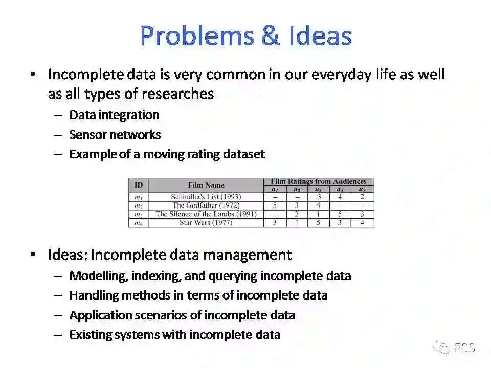 由于交付失败、断电、意外丢失等原因产生的不完整的数据在生活中比比皆是,也几乎涵盖了科学研究的所有领域。然而,如何对不完整数据进行建模、索引和查询成为了一个巨大的挑战。例如,由于处理方法不当,对不完整数据的查询结果往往不尽如人意。