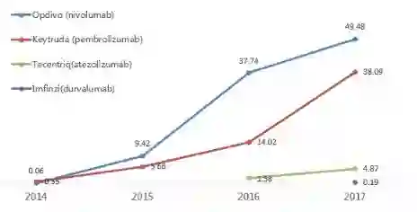 全球目前共批准上市了5个PD-1/PD-L1单抗药物,2017年全球PD-1/PD-L1药物的市场规模达到100亿美元左右。中国是肿瘤大国,PD-1药物的竞争十分激烈,目前已经有百时美施贵宝Opdivo、信达生物信迪单抗、默沙东Keytruda陆续申请上市。
