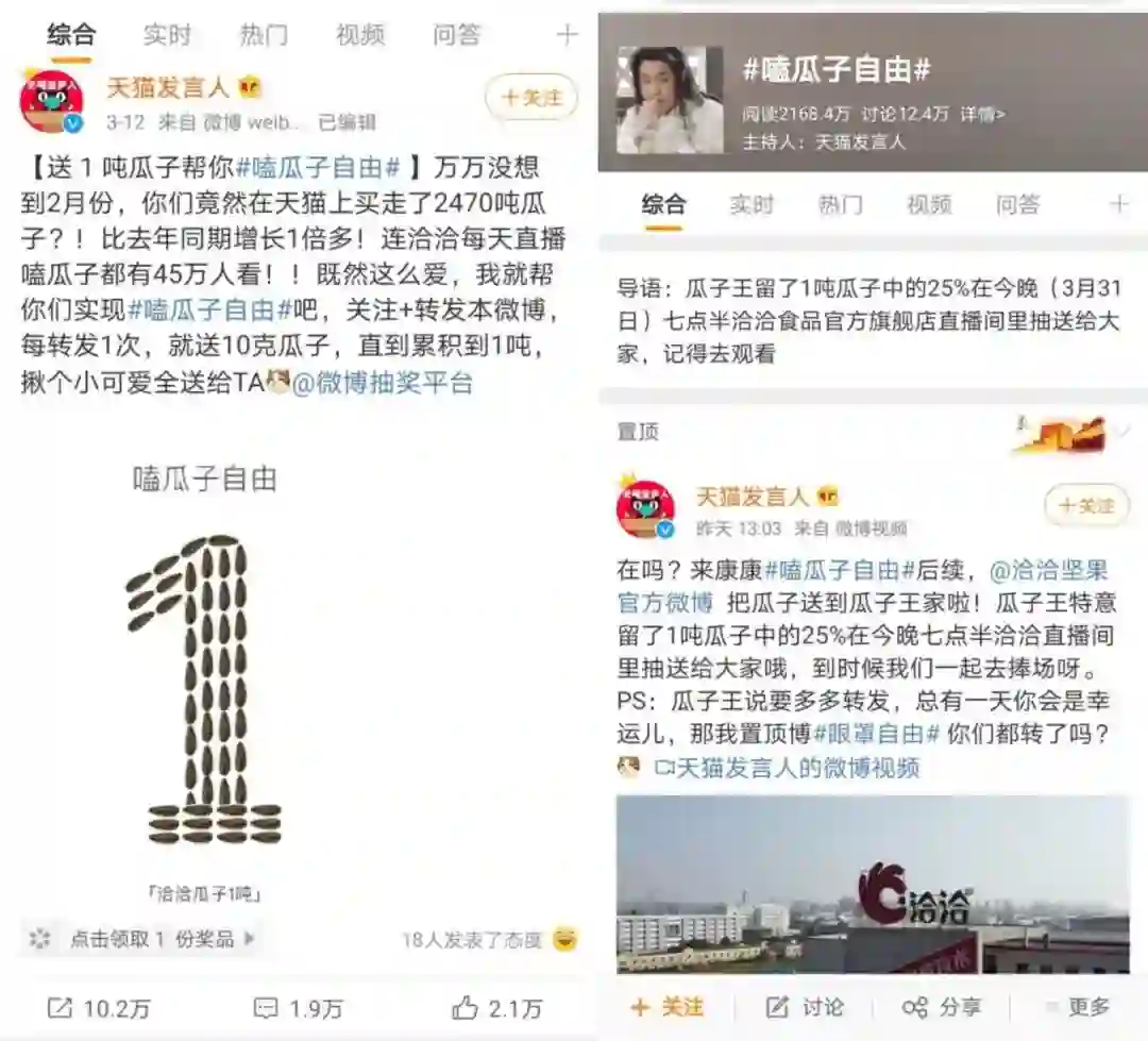 这之后,洽洽又以微信小程序生态为基点,上线“老陈葵园”小游戏。游戏世界观结合洽洽的品牌形象和产品进行设计,场景设定为一望无际的大葵园,用户在游戏内扮演葵园的经营者,在葵园内种植向日葵,坚果树等植物。此外,洽洽还联合天猫发起“送1吨瓜子,帮你实现嗑瓜子自由”活动、全球瓜子拼图大赛,通过一系列趣味营销策略,增强品牌吸引力,实现潜在客流转化,进而沉淀精准粉丝,提升用户粘性,提高产品的销售转化率。