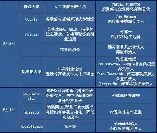 接下来的8天时间里,他们将开启一段对于未来的探索之旅,走访英伟达、Amazon Go、波音公司、NASA、奇点大学、斯坦福等近20家前沿企业或机构。著名华裔科学家张首晟、Airbnb创始人、波音公司中国区总裁等30余位硅谷著名投资人、企业创始人/高管将为学员带来精彩干货与思想碰撞。