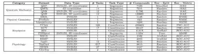 表 1:数据集细节:化合物和任务的数字、推荐的数据分割和度量。