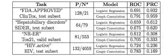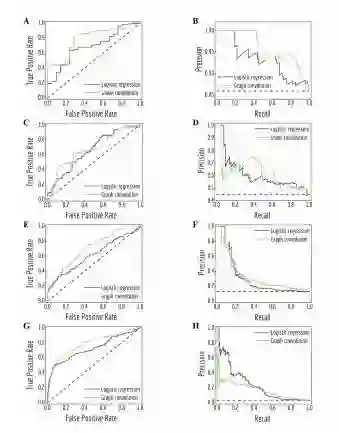 图 4:不同类别不均衡条件下,logistic 回归和图卷积模型预测的受试者工作特征(ROC)曲线和准确率-召回率曲线(PRC)。A、B:测试子集 ClinTox 中的「FDA APPROVED」任务;C、D:测试子集 SIDER 中的「Hepatobiliary disorders」任务;E、F:验证子集 Tox21 的「NR-ER」任务;G、H:测试子集 HIV 的「HIV active」任务。黑色虚线代表随机分类器的性能。