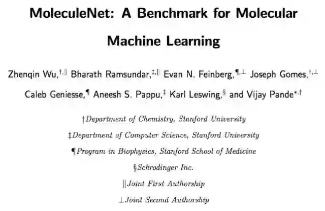 过去几年中,分子机器学习快速发展成熟。方法的改进和大型数据集的出现使得机器学习算法对分子特性的预测精度变高。但是,由于缺乏对比不同方法性能的标准基准,算法进步受到限制。大多数新算法以不同数据集为基准,这使得评估方法的质量难度很高。本研究介绍了用于分子机器学习的大型基准 MoleculeNet。MoleculeNet 提供多个公共数据集、建立了评估度量,并提供之前提出的多个分子特征化(molecular featurization)和学习算法的高质量开源实现(作为 DeepChem 开源库的一部分发布)。MoleculeNet 基准证明可学表征是分子机器学习的强大工具,能够广泛提供最优性能。然而,仍然有一些需要注意的地方。可学表征仍然需要在数据匮乏和分类严重不均衡的情况下处理复杂任务。对于量子力学和生物物理数据集来说,物理性特征化的使用比特定学习算法更加重要。