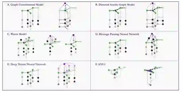 图 6:MoleculeNet 中实现的基于图的模型的核心结构。目的在于为中间的深绿色原子构建特征:A 图卷积模型(Graph Convolutional Model):特征通过邻近原子的连接进行更新;B 有向无环图模型(Directed Acyclic Graph Model):所有连接直接围绕中心原子,特征通过直接连接从最远的原子传送到中心原子;C Weave Model:每对原子(包括不直接连接的成对原子)都可以组对,中心原子的特征通过所有其他原子和相关的对进行更新,对特征通过组对的两个原子的连接进行更新;D 消息传递神经网络(Message Passing Neural Network):邻近原子的特征输入依赖连接类型的神经网络,再输出(消息)。中心原子的特征通过输出进行更新;E 深度张量神经网络(Deep Tensor Neural Network):没有明确的连接信息,特征通过其他原子对应的物理距离进行更新;F ANI-1:特征通过成对原子(径向对称函数)之间的距离信息和三个原子(角对称函数,angular symmetry function)之间的角度信息构建而成。