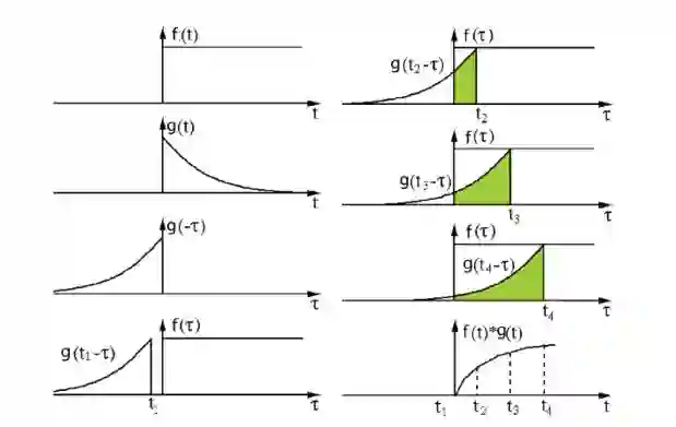 它的定义是:一个函数经过翻转和移动后与另一个函数的乘积的积分。下面的图像形象化地展示了这个思想: