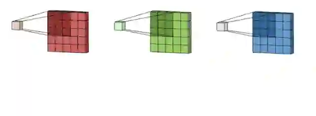 面向多通道的 2D 卷积的第一步:过滤器每个卷积核分别应用到输入层的 3 个通道上。图片源自:https://towardsdatascience.com/intuitively-understanding-convolutions-for-deep-learning-1f6f42faee1