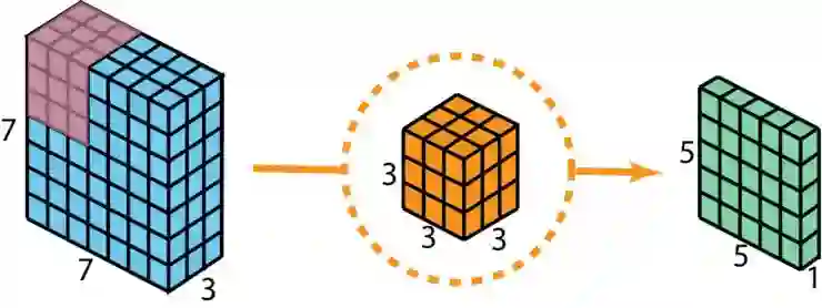在介绍这些步骤前,值得回顾一下前面部分所提到的 2D 卷积核 1x1 卷积。让我们先快速过一下标准的 2D 卷积。举一个具体的案例,假设输入层的大小为 7 x 7 x 3(高 x 宽 x 通道),过滤器大小为 3 x 3 x 3,经过一个过滤器的 2D 卷积后,输出层的大小为 5 x 5 x 1(仅有 1 个通道)。