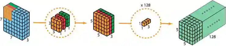 深度可分离卷积完成这两步后,同样可以将一个 7 x 7 x 3 的输入层转换为 5 x 5 x 128 的输出层。