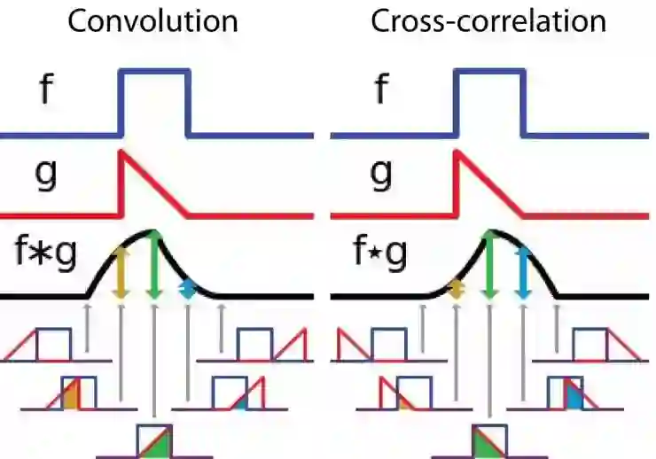 在信号处理中,卷积和互关联的区别。图像来源:https://en.wikipedia.org/wiki/Convolution