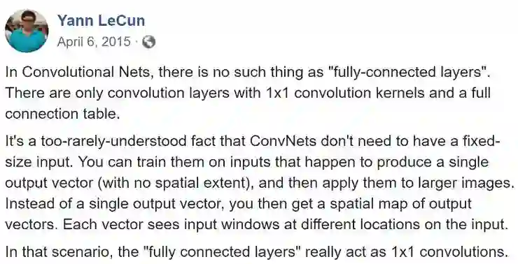 针对 1 x 1 卷积,Yann LeCun 提出了一个非常有趣的角度:「在卷积网络中,不存在像「全连接层」这样的东西,而只有含有一些 1x1 卷积核和 1 个全连接表的卷积层」