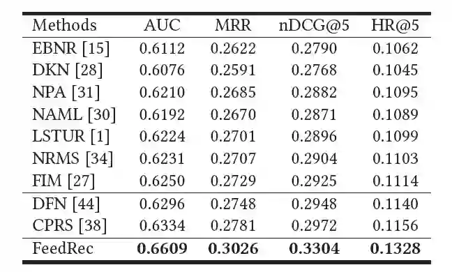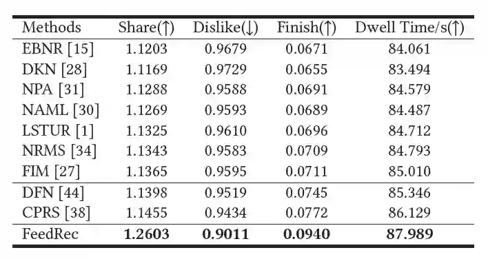 研究员们在一个从新闻 App 中收集的数据集上开展了实验。表1的结果显示 FeedRec 可以有效地提升多种点击率指标。表2进一步显示 FeedRec 可以提升多方面的用户黏性,更可能为用户推荐喜爱的新闻内容,改善用户的新闻阅读体验。