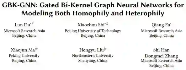 针对这个问题,微软亚洲研究院的研究员们通过实证分析发现,无论是在被普遍认为是同配图的数据集还是异配图的数据集上,都存在着相当数量的异配子图,且子图的异配度参差不齐,而传统模型如 GCN 在同配子图上往往表现优异,但在异配子图上发挥较差,这充分说明了能同时建模同配和异配性模型的必要性。研究员们通过理论分析了 GCN 不能有效建模混合了同配和异配性的图的原因,并进一步提出了一种基于双核特征转换和门(Gate)机制的新型 GNN 模型: GBK-GNN。GBK-GNN 的结构如图4所示,其通过两个不同的核分别捕获同质和异质信息,并引入门来进行核的选择。这种方式能避免特征变换后的聚合操作将可区分的特征平滑化,从而能够提高模型对同质性及异质性的建模能力。