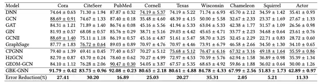 研究员们在具有不同同质异质特性的七个真实数据集上进行了广泛的实验。实验结果表明,与其他 SOTA 方法相比,GBK-GNN 有稳定且显著的提升。表3显示了不同模型在各个数据集上的分类准确率。