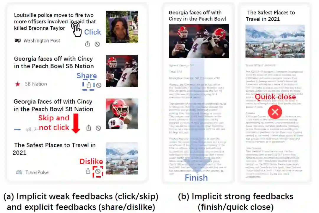 其实,在新闻平台上通常存在多样化的用户反馈,如图1所示。除了用户的点击与跳过等较弱的隐式反馈以外,还存在如分享和不喜欢等显式反馈与完成阅读或快速关闭等较强的隐式反馈。这些多样的用户反馈可以为推测用户兴趣提供更为全面的信息。