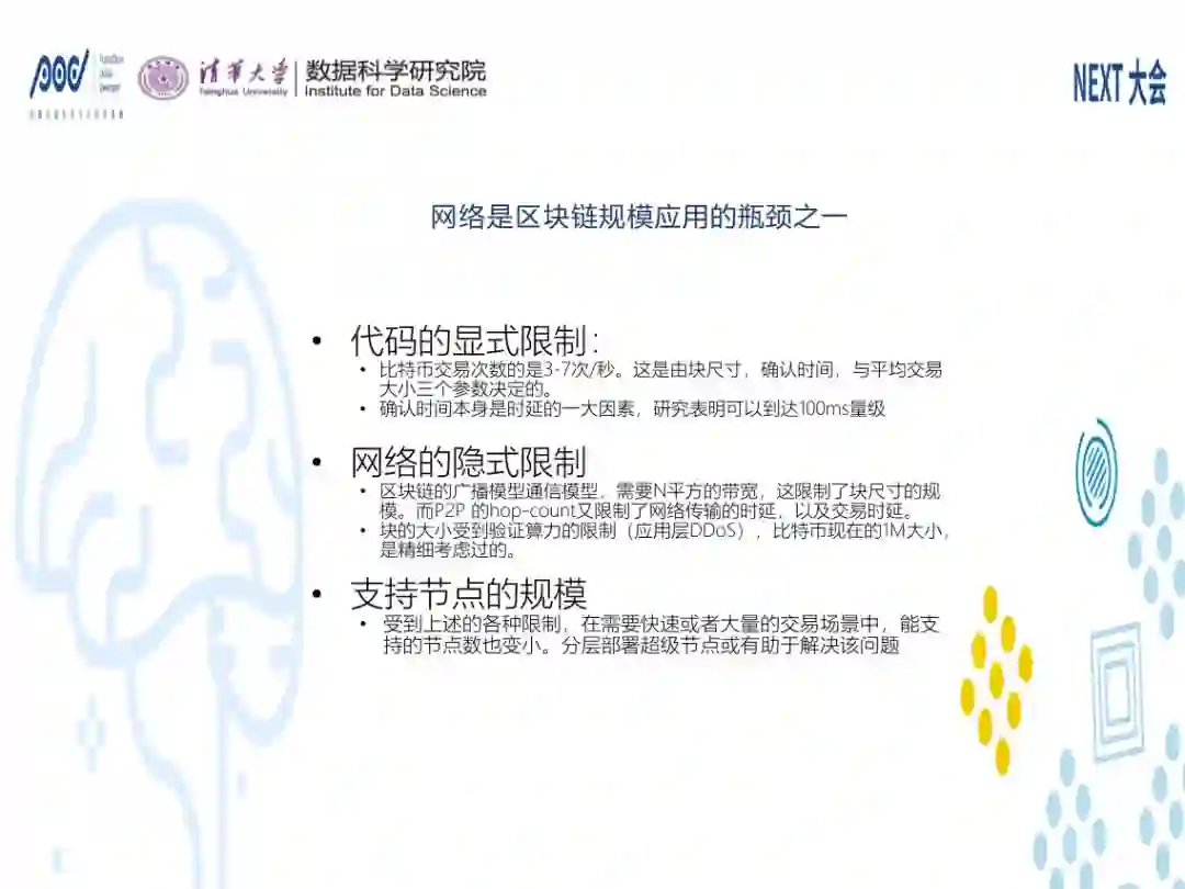 第二,交易的时延和带宽是不一样的东西。比如我烤匹萨10个小时,同时烤了10块匹萨,我回头跟人说,10个小时烤了10个披萨,平均时间1小时。这里面是有误导的。时延就是说,到底烤一块匹萨多久,这对于实际应用很有价值。我们来看看它受到什么限制呢?一些是我们看得见的,就是代码里面可以看到,就是显示限制,比如交易尺寸、快、平均大小。当像中本聪这样世界级的设计者,他们设计的时候,是考虑后面的限制。算法现在的研究可以达到100毫秒以下,我们网络也做到100毫秒以下,1+1等于200毫秒,再给以3倍的安全系数,目标可以到600毫秒。由于广播的模型,会导致它的规模也不会很大,所以要解决这个问题,可能要通过一些分集,用联盟链的方法来处理。