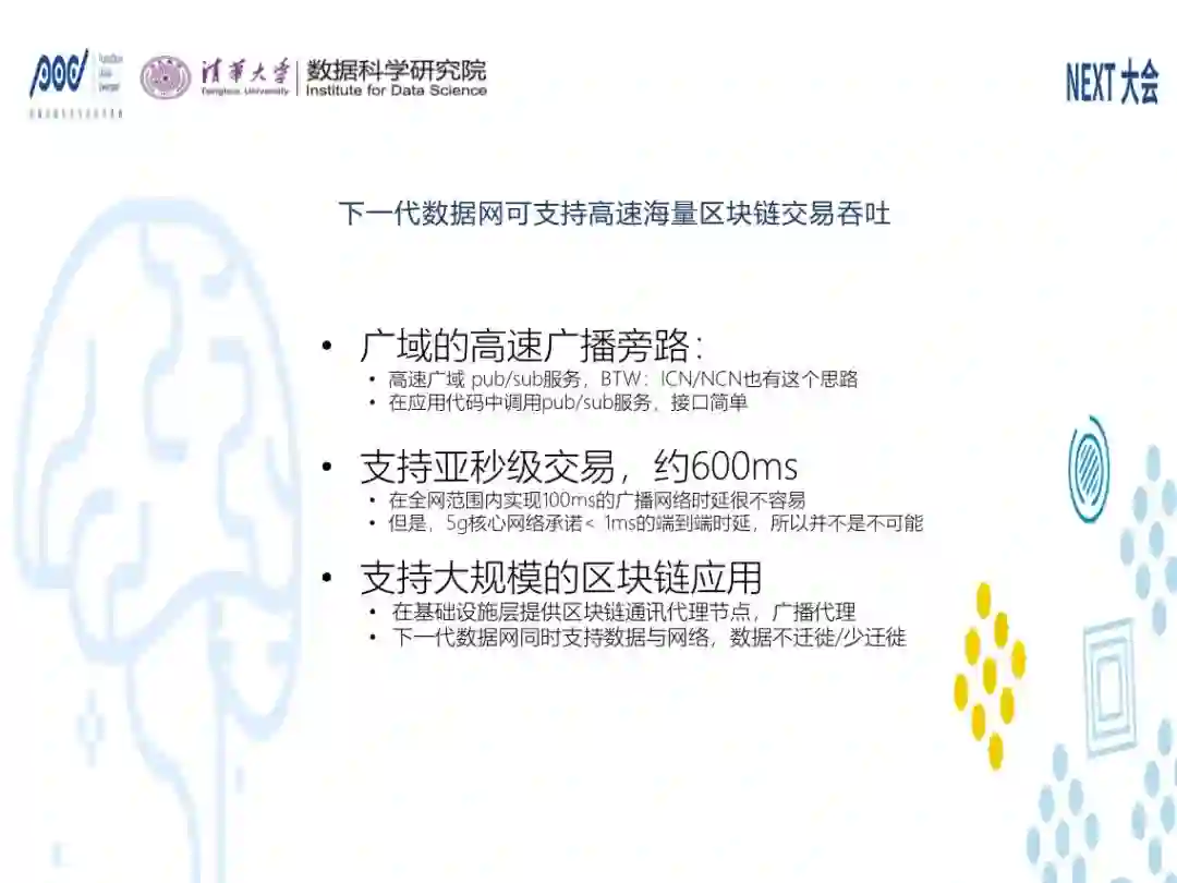 下一代的数据网络,它可以支持高速、海量区块链吞吐。首先在广域里面部署一个服务,同时能够支持毫秒级、亚秒级的交易,能够实现规模化的区块链应用。为什么呢?因为我们在广播里面增加广播代理,不要每个人都去广播,这就是联盟链的观点。