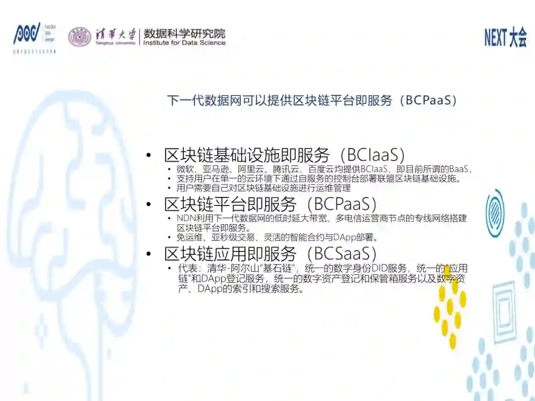 这一块清华大学希望我们能够提供一些区块链设施、平台以及应用作为服务。而且区块链在阿尔山的基础区块链项目里面已经做了这样的场景。这是清华区块链现有的下一代数据网的设计方案及想要实现的目标。