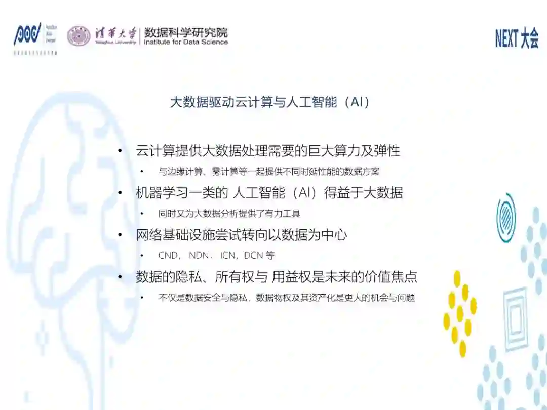 基础设施试图转向以数据为中心的场景,大家已经比较熟悉一些CDN、NDN、ICN、DCN,本质是把网络从比特流转向数据。我们认为未来的价值焦点,也就是从大数据视角来看,它不仅仅是数据隐私的问题,首先是数据的所有权。数据的隐私,首先数据是我的,你凭什么拿去用,拿去用有没有好处,这个好处是不是我应该得到。这才是我们认为下一阶段大数据的核心问题。