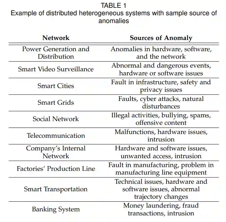许多分布式异构系统在关键和/或重要领域(如发电和配电系统)运行。因此,它们的安全性和正确性至关重要。漏洞可以在这些系统的每个方面和不同的抽象层次中看到;从系统或网络中存在问题的单个组件,到发现这些组件相互连接以完成更高级任务的异常或不正常情况。表1显示了几种分布式异构网络及其可能的异常来源。在这些系统中,异常检测必须满足许多要求,这使得任务更加复杂。考虑到异常的性质,异常必须通过处理大量数据来检测,这使得检测异常是一项具有挑战性的任务,而且现实世界的设置也有限制。