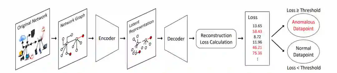 用于异常检测的图自动编码器网络。有两个恶意用户(相当于网络图中的异常节点)连接到网络中。将网络图输入自编码器,计算节点和边缘的重构损失。在这个简单的例子中,只需要将重建损失与一个恒定的阈值进行比较,就可以检测到异常,但是这个过程可以更加先进和精确。