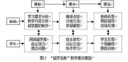 “研学后教”教学模式是以教师的“三研”:即以教学目的、教学对象和教学内容为前提,以“研学案”为主要载体,以学生的自主探究与合作为主要形式,帮助学生实现多元化发展,提高综合能力和教学质量,让学生在探究性的学习过程当中学会研究问题的方法,培养学生敢于创新的精神[7]。“研学”主要是指教师在深入研究学情、学法和课标、教材的基础上开发“研学案”,学生在“研学案”的指引下通过自主学习、合作探究,掌握知识和方法;“后教”主要针对学生钻研后存留的疑点与难点,学生互相交流、教师点拨与拓展,充分有效地达成教学目标[8]。其教学流程从课前到课中再延伸到课后,教师和学生在每个环节有不同的任务,该教学模式结构模型见图2所示。