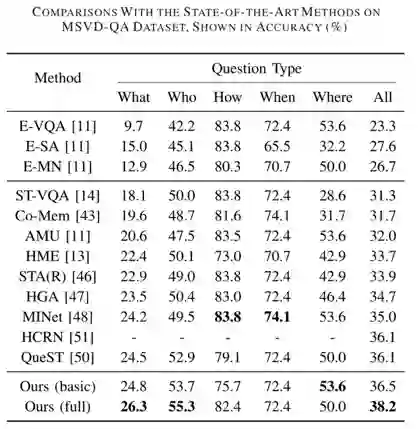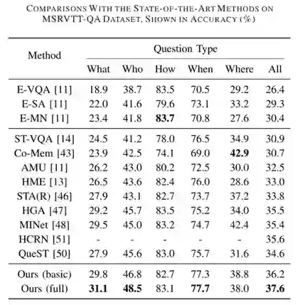 在三个广泛使用的视频问答数据集(MSRVTT-QA、MSVD-QA和TGIF-QA)上的实验结果表明,我们的模型相较于其他方法均获得了一定提升,下图展示了部分结果,完整结果可参考原文。