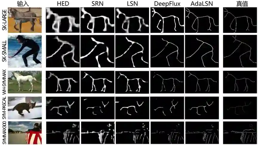 图4 在常用的骨架检测数据集上进行骨架检测的示例。