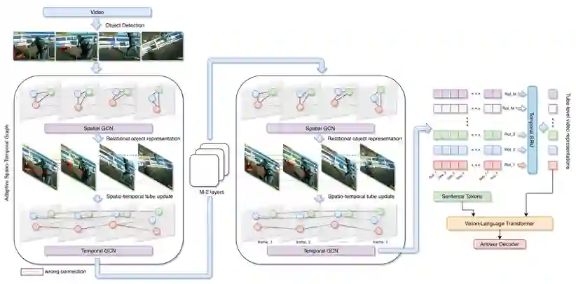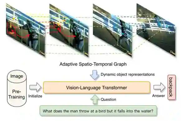 在这项工作中,我们尝试利用Vision-Language Transformer架构来解决视频问答任务。然而,考虑到计算资源和时间成本的限制,我们没有像以前的工作那样使用视频数据对其进行预训练。相反,我们站在一个新的角度试图通过共享一个通用的模块设计,利用图像-语言预训练来帮助视频-语言建模。新的方法继承了现有高质量图像-语言数据和预训练模型的优点,提供了丰富的静态视觉语言交互信息。此外,我们引入了一个自适应时空图模块来增强视觉-语言的表示学习,它可以根据显著对象的时空关系自适应地修改对象的时空链接表征。如图 1 所示,示例是关于“一个人向一只鸟扔背包”。人、背包和鸟之间的相对时空关系有助于捕捉每个物体的详细时空动态。通过利用分层图卷积网络和时序GRU,我们最终可以获得许多细粒度的动态视频对象表示,作为视觉-语言Transformer模块的视觉输入信息。图2展示了更多模型细节。