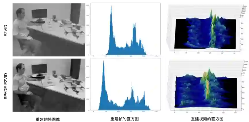 理论上,由于这个特性,可以对事件相机生成的图像进行数学积分来恢复所有像素的值。但实际上,事件相机存在很多内部噪声。不过近年来由于神经网络的使用,这个问题得到了解决。开展基于事件的高质量视频重建的第一个工作是E2VID。SPADE-E2VID基于E2VID,并做出了一些有趣的改进。我们在第一帧中进行了更好的重建,如图3所示,并减少了训练时间,增加了对比度和时间一致性;并且使用非极性事件进行图像重建。