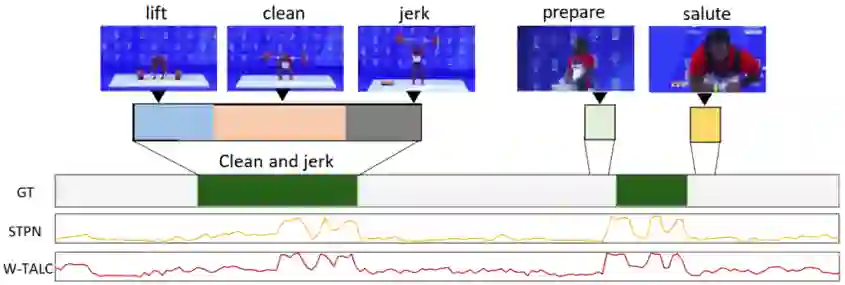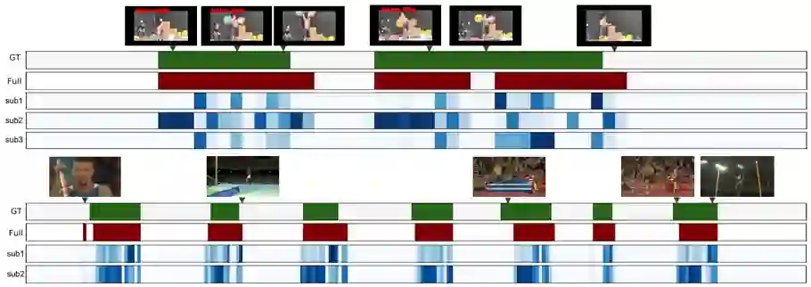图3是定位结果的展示。绿色部分是真实标注,红色部分是我们的预测结果,可以看到我们方法的预测结果与真实值的误差很小。此外,蓝色的部分也展示出了该类别所对应的子行为的定位结果,可以看到学习到的子行为具有一定的语义信息,比如第一个例子的第二个子行为对应于挺举中的拉杠铃这一子行为。