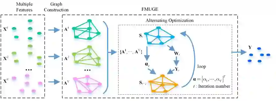 图1总结了FMUGE的工作原理。给定多视图数据{Xv}v=1V,我们首先构造各视图的相似度图{Av}v=1V。在降维过程中,FMUGE自适应地分配权重{αv}v=1V以融合多个视图,并根据{Av}v=1V所编码的样本间相似性和学习到的低维嵌入Y共同优化得到一个多视图共识相似度图S。随后,基于S实施图嵌入,通过交替优化得到最优的低维嵌入Y。Y可代替原始高维数据用于实际应用。