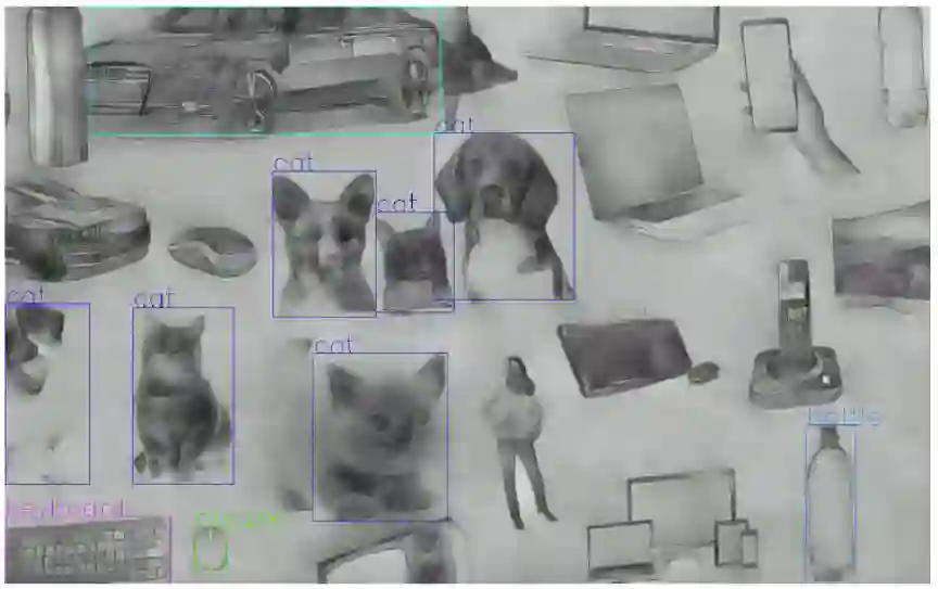 图6 使用CeleX5 事件相机的非极性事件的图像重建。基于YOLOv4目标检测算法,引人注目的是所有的狗都被识别为猫。
