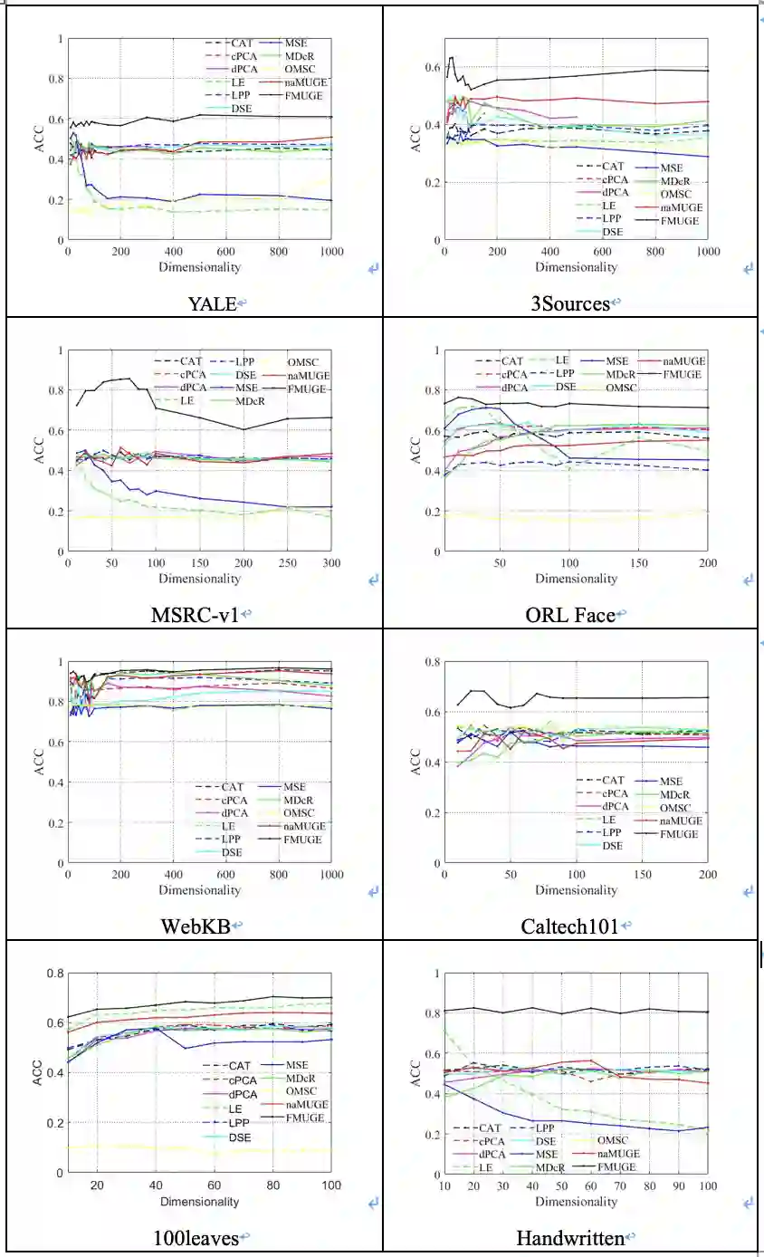 图3 FMUGE和所有比较方法在不同数据集上学习到的不同维度低维嵌入的聚类准确率。
