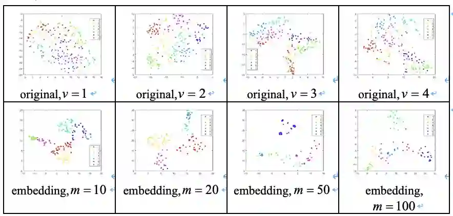 图2 MSRC-v1数据集各视图特征和FMUGE在MSRC-v1数据集上学习到的不同维度低维嵌入的t-SNE可视化。上面一行是原始数据的四个视图,下面一行分别是学习到的多视图嵌入。
