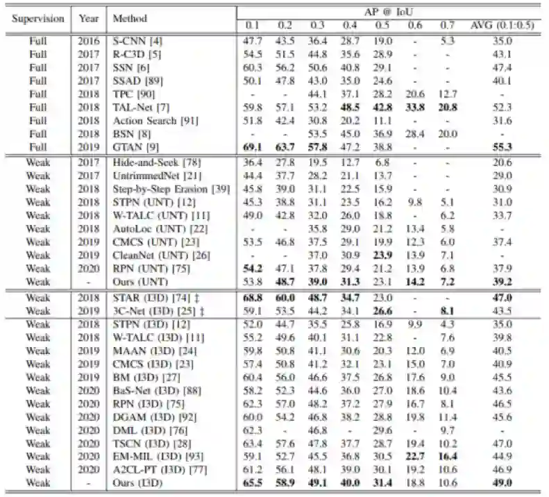 我们的方法在两个常用的行为定位数据集上均取得了当时最好的结果。尤其在THUMOS14数据集上,在平均mAP评价指标上超过了最好的方法2.0%。
