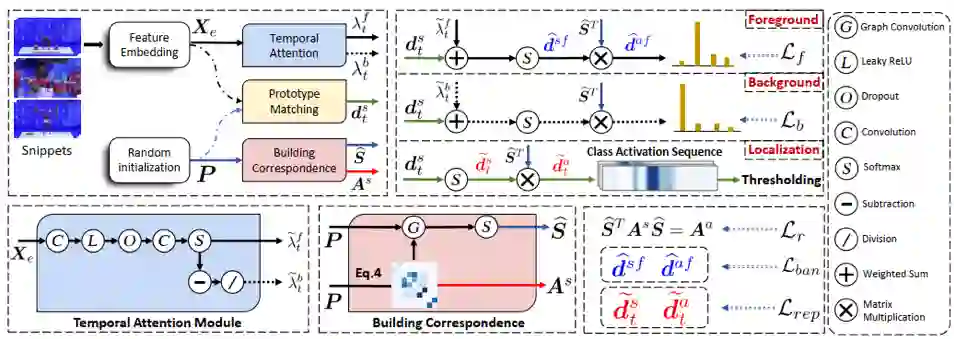 图2中展示了我们方法的网络框架。由于没有子行为标注,我们提出采用随机初始化的原型来代表子行为。我们通过原型网络将视频特征投影到子行为空间中,随后利用图卷积建模子行为之间的关系,通过图池化的方法建立子行为与真实行为类别之间的从属关系,从而将子行为空间中的预测结果转化为真实行为类别的预测结果。此外,我们提出了两种损失函数使学习到的子行为有区分性并具有一定的语义信息。