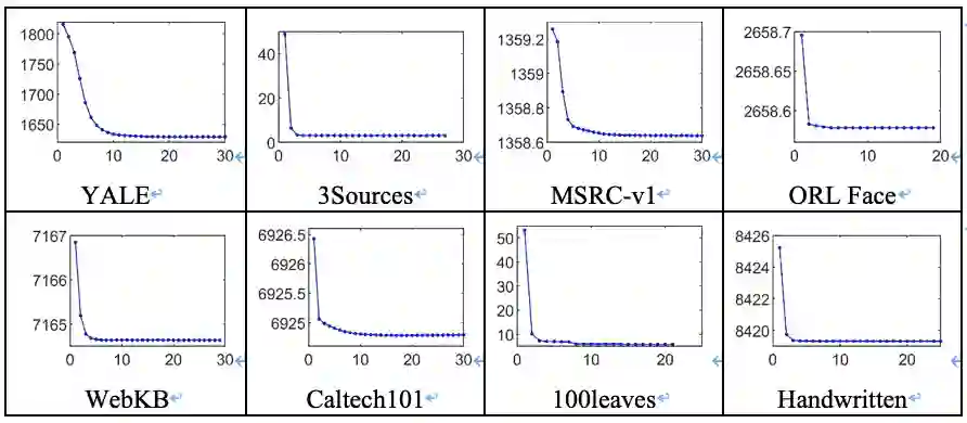 图5 FMUGE在不同数据集上的目标值收敛曲线(x、y轴分别代表迭代次数和目标值)。